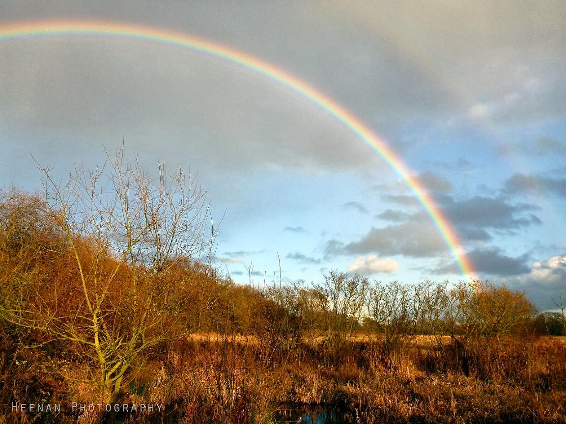Even the rainy days have their rainbows. This photo was taken in the Roding Valley, and shows a double rainbow over the wet meadows and fen of the Nature Reserve that runs along the River Roding near Loughton and Chigwell, Essex, England. The reserve follows the river for roughly a mile and a half, and in addition to providing a place for the Roding to flood (thus alleviating some of the flooding pressure downstream) the reserve also contains a number of important plant and animal species. The nature reserve contains the the largest remaining area of water meadows in Essex, according to Essex Wildlife Trust. I like the warmth of the late light here bathing the bare trees and shrubs, and picking out the sere grasses in the background.